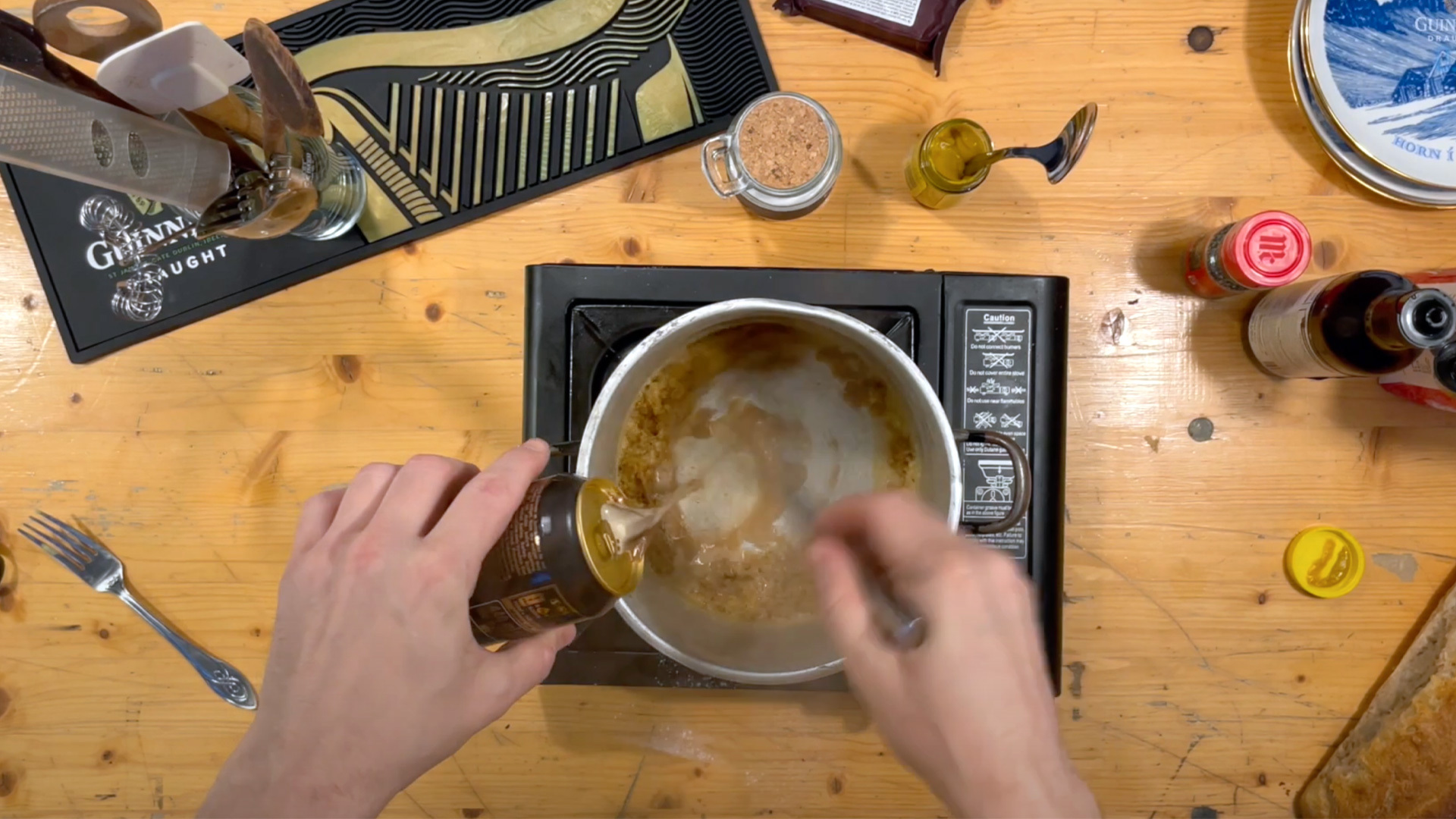 Hellið Guinness út í smjörbolluna ásamt ensku sinnepi og worcestershire sósu saltið og piprið